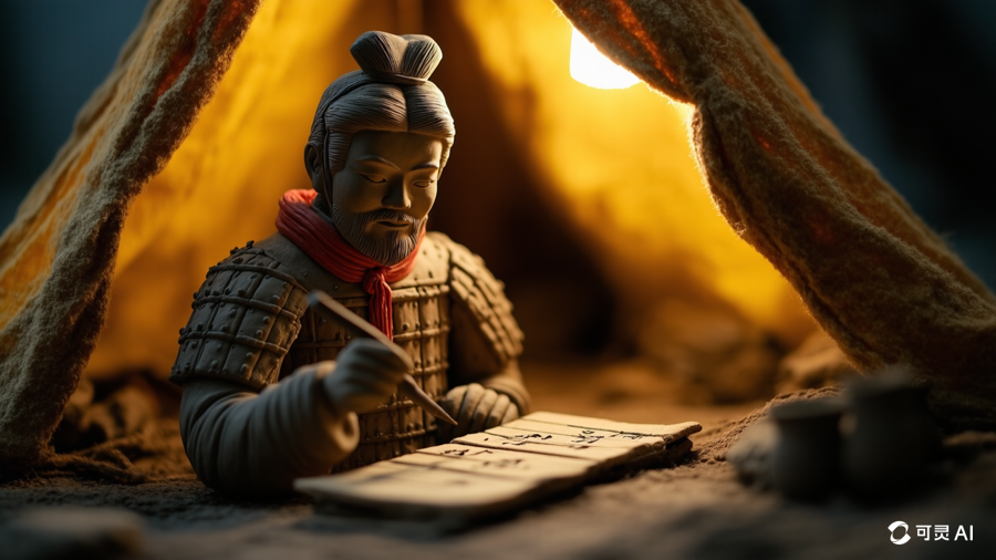 图片由AI生成,提示词为“秦军士兵在昏黄的灯光下写字”。
